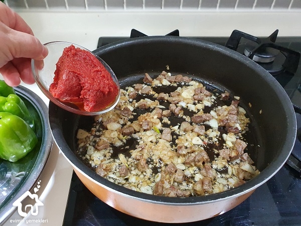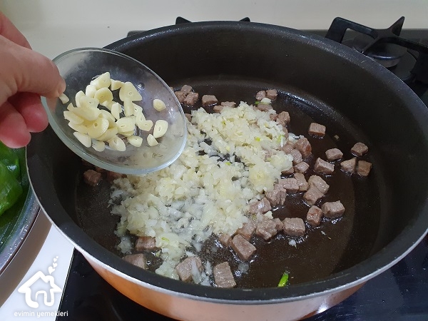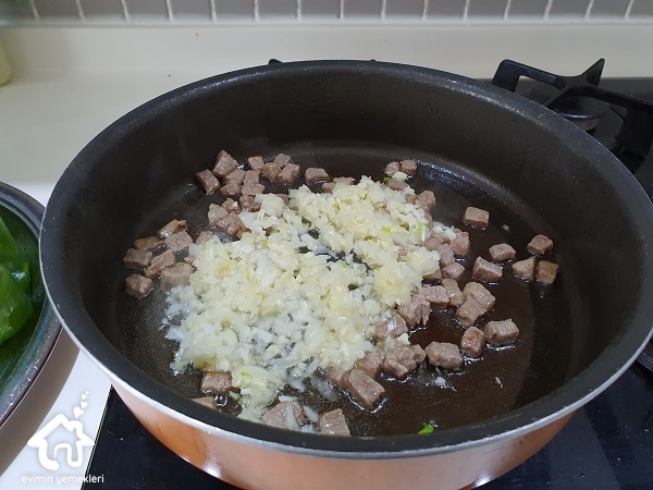 Öncelikle biberleri ovalayarak yıkayalım. İçinin çekirdeklerini çıkaralım. Biberleri ağzı aşağı gelecek şekilde ters çevirip tepsiye dizelim suları süzülsün. Daha sonra iç harcını yapmaya başlayalım. İç harcı için gerekli olan soğanı incecik doğrayalım. Daha sonra sarımsağı doğrayalım. Tavaya zeytin yağını alalım. Et yada kıyma ne kullanacaksanız ilave edelim. Et suyunu salıp geri çekene kadar pişirelim. Daha sonra soğanı ilave edelim. Soğanlar şeffaflaşana kadar pişirelim. Soğanlar pişmeye yakın sarımsağı ilave edelim. Beraber pişirelim.