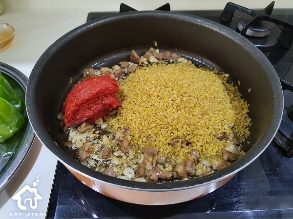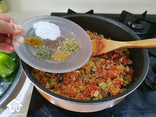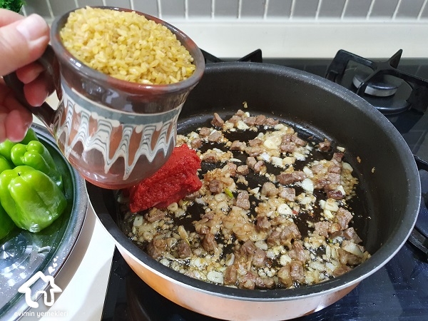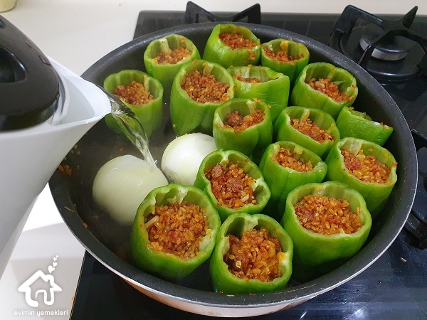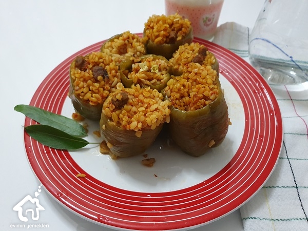 Daha sonra bulguru ilave edip biraz beraber kavuralım. Daha sonra tuz, salça ve baharatları ilave edelim. İyice karıştıralım. Ocağı kapatalım. Biberlerin ağzı yukarı gelecek şekilde dolmaya uygun bir tencereye dizelim. Biberlerin içine hafifçe tuz serpelim. Daha sonra iç harcını yarısını biraz geçecek şekilde biberlerin içine dolduralım. Daha sonra kaynar suya bir kaşık salça ilave edip karıştıralım. Salçalı suyu biber tenceresine biberin üstüne gelmeyecek şekilde dökelim. Kısık ateşte tencerenin kapağı kapalı olacak şekilde iki saat pişirelim. Tüm bulgurlar suyu çekip yumuşayınca ocağı kapatalım. Kapağı kapalı bir şekilde yemeği yarım saat dinlendirelim. Daha sonra servis tabağına alıp yanında yoğurt salata ve arzu edilen diğer yemeklerle birlikte servis edelim. Deneyen herkese şimdiden afiyet olsun. Sevgilerimle.