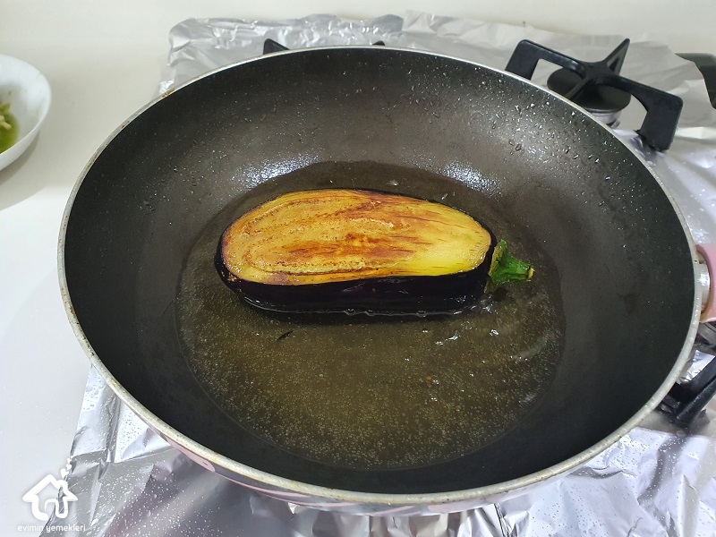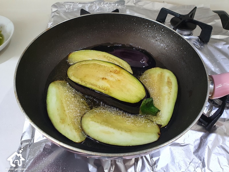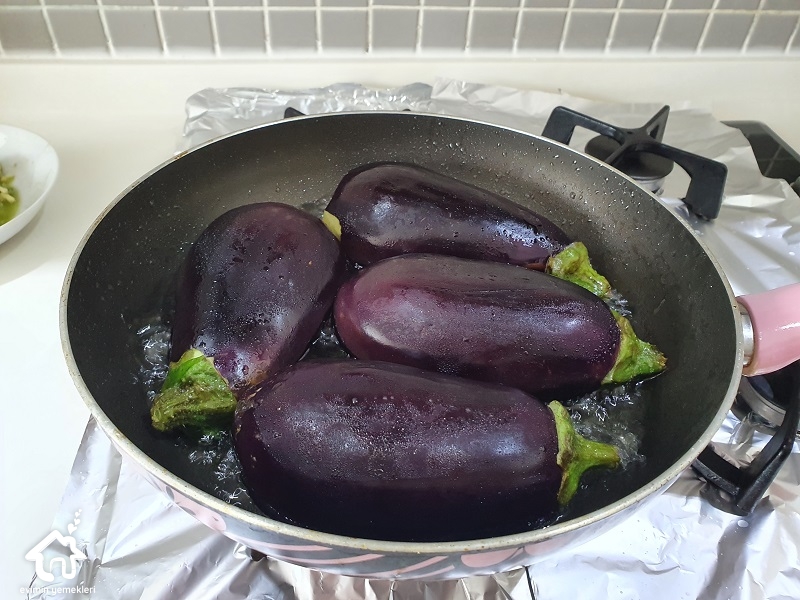 Karnıyarık dolmamızın yapımı için önce patlıcanları yıkayıp kurulayın. Yan tarafından çizin veya kapak gibi kesin. Derin bir tavaya sıvı yağı koyup ısıtın. İyice ısınan yağda patlıcanların her yerini çevire çevire kızartın. Karnıyarık tenceresine dizin. Bıçakla içi kısımlarına çizikler açıp boşaltın soğumaya bırakın.