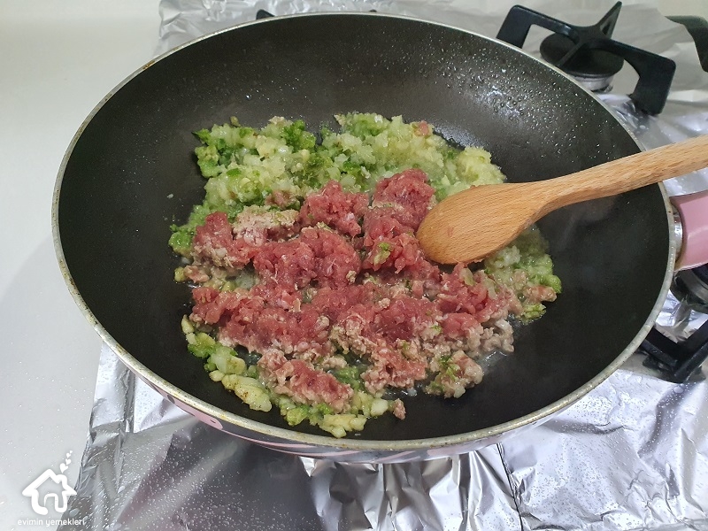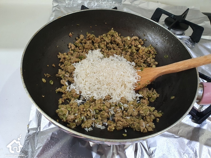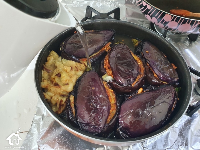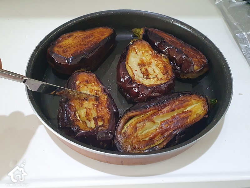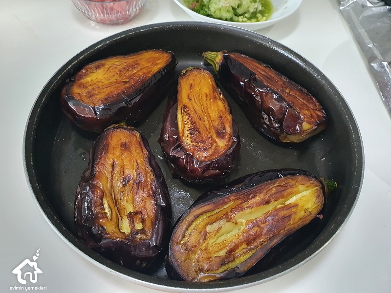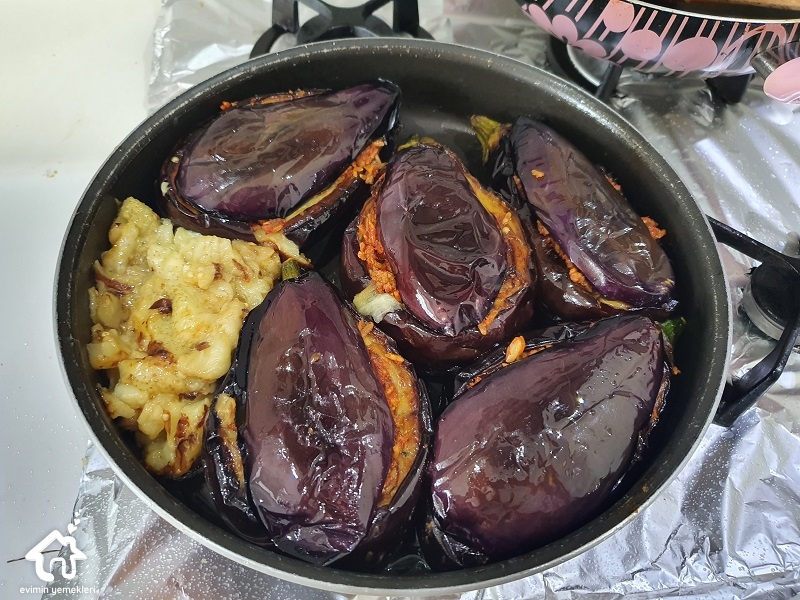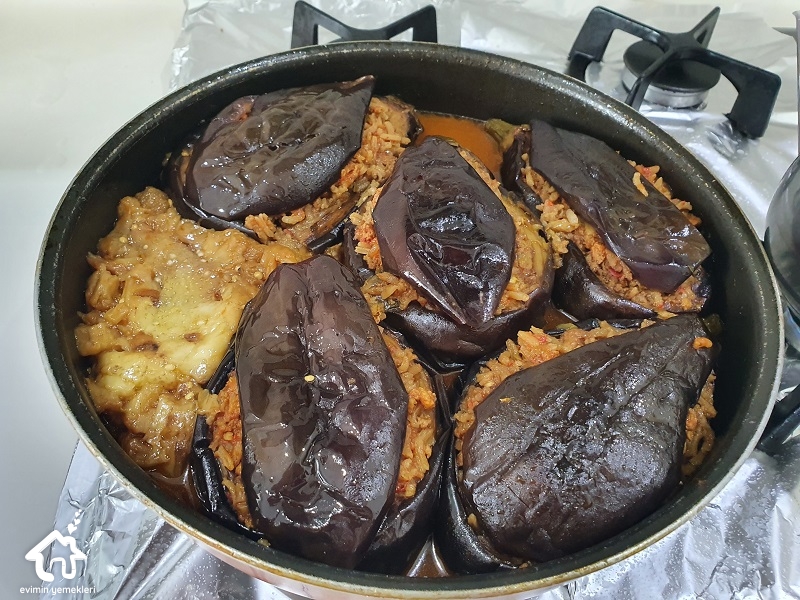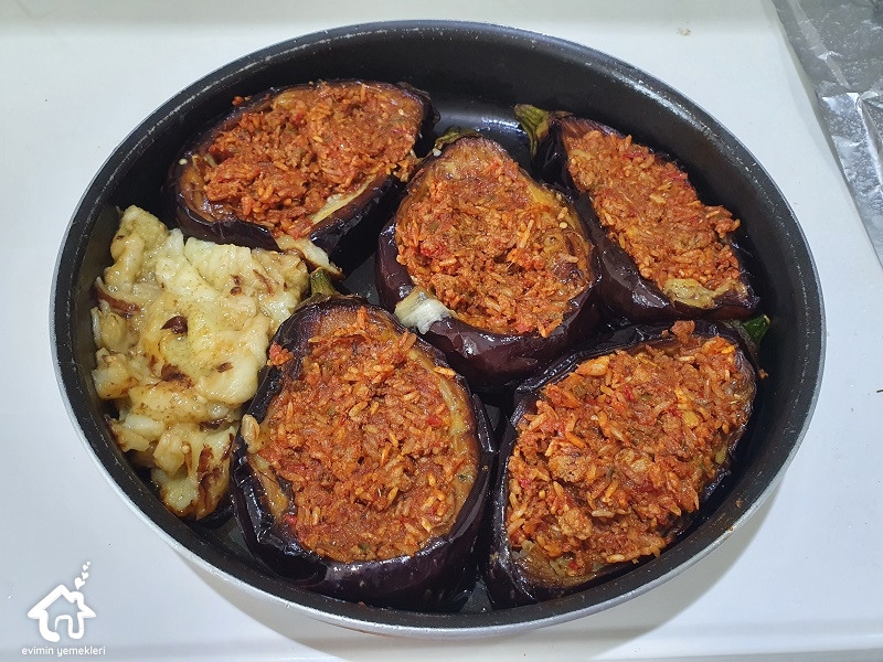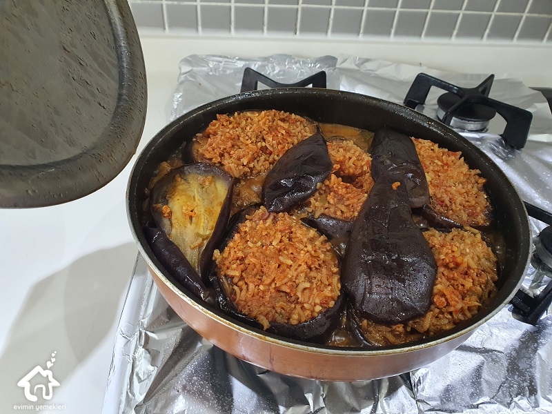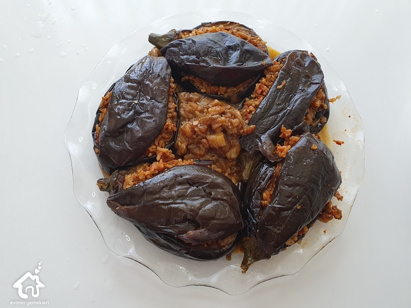 Patlıcan soğurken iç harcını hazırlayalım. İç harcı için ince kıyılmış soğan sarımsak ve biberi kıymayla birlikte bir tavada kavurun. Pirinci yıkayıp tavaya ilave edin. Salça tuz ve baharatları da tavaya ilave edin biraz daha çevirin karıştırın ve altını kapatın. Patlıcanların içini kenarları çok ince olmayacak şekilde boşaltın. Boşalttığınız kısmı çöpe atmayın patlıcanların arasındaki boşluklara koyun. Kase gibi olan patlıcanlara iç harcını eşit şekilde doldurun. Üzerine çıkmayacak kadar kaynar su koyup kısık ateşte kapağı kapalı şekilde pişirin. Suyu yetmezse ilave edersiniz. Pirinci pişen dolmayı kapatın. 30 dk dinlendirip servis edin afiyet olsun. Deneyen herkese şimdiden afiyet olsun. Sevgilerimle.