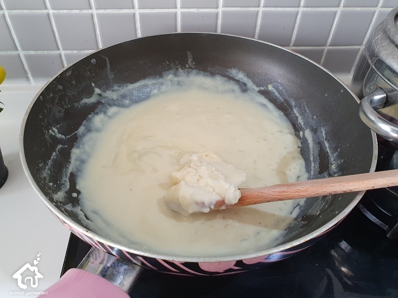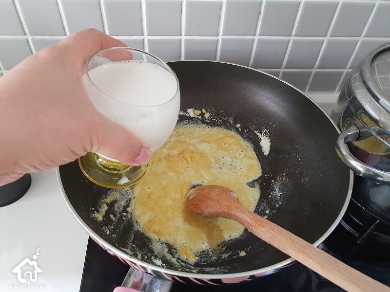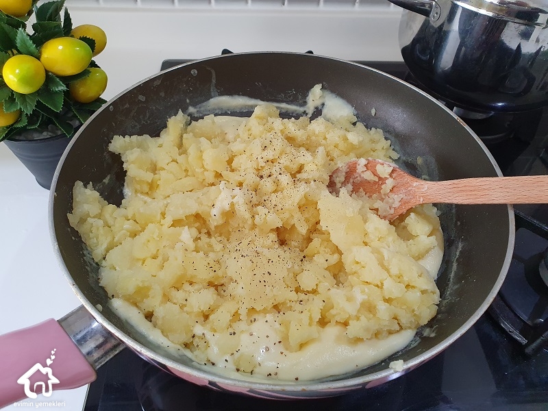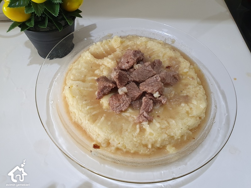 Yatağı için haşlanmış patatesi püre yapın, tabakta kalsın. Ayrı bir yerde derin bir tavaya tereyağı ve mısır ununu alın, unu kavurun ve rengi değişmeden sütü ilave edin. Devamlı karıştırıp boza kıvamına getirin patates püresi, tuz ve karabiber ilave edip karıştırın. Et pişince kalan suyu var ise bu karışıma ilave edip püreyi tekrar iyice karıştırın. Karıştırma işlemi için dayanıklı bir çırpma teli yada büyük bir çatal kullanabilirsiniz.