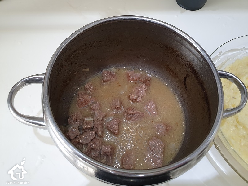 Yemeğin yapımına kebabından başlayalım. Kebabı için tereyağı düdüklü tencereye koyun. Üzerine kuşbaşı et bütün soğan ve sarımsağı koyup soteleyin. Üzerine kaynar su ve tuz atıp düdüklünün kapağını kapatın. 1 saat pişirin etler iyice yumuşasın. 1 saatin sonunda etler yumuşadı ve biraz et suyu kaldı ise bunu bir su bardağına alın bunu patates püresinde kullanacağız.