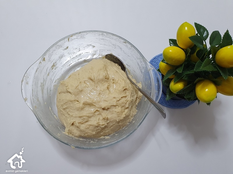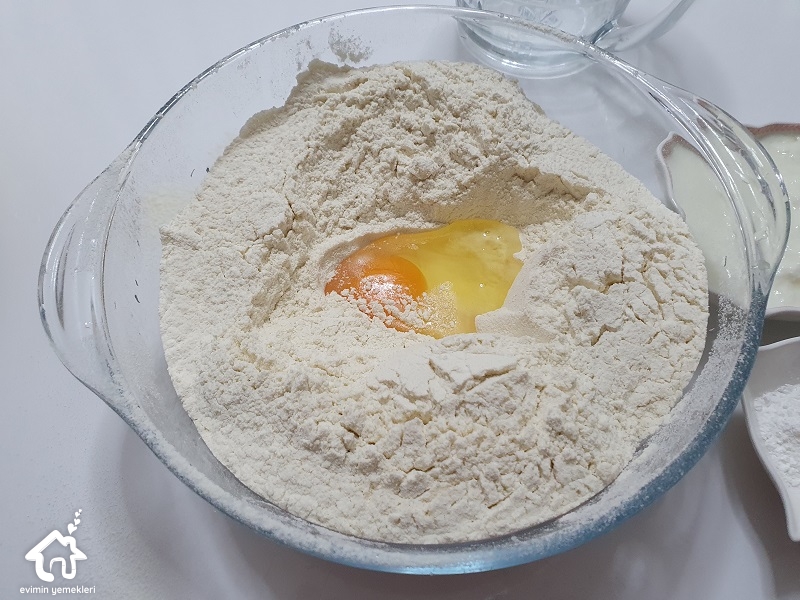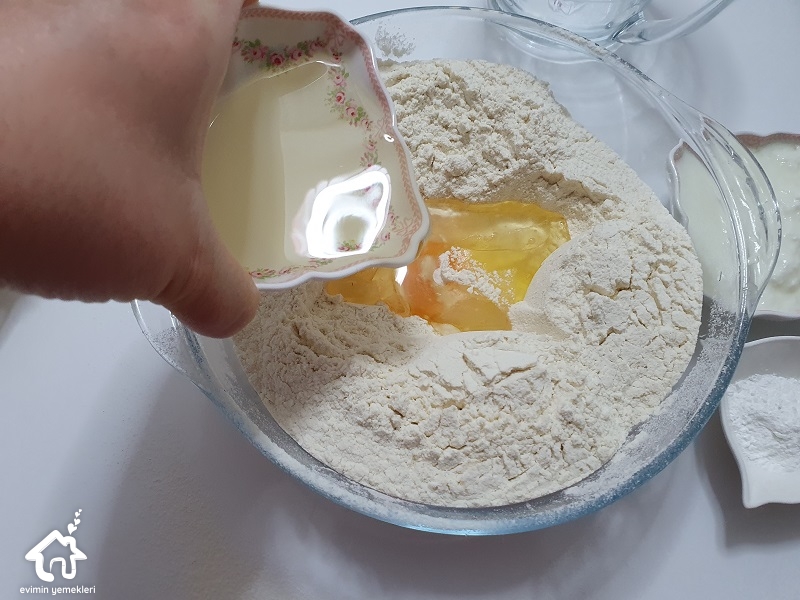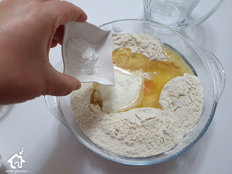Poğaça hamuru için gerekli olan oda sıcaklığındaki yoğurt, yağ, yumurta ve ılık suyu karıştırma kabına alıp karıştıralım. Üzerine tuz ve şekeri ilave edip karıştıralım. Daha sonra kabartma tozunu döküp karıştıralım. Fısır fısır kabarmaya başlayan bu harcın üzerine yavaş yavaş unu ilave edip yumuşak bir hamur elde edelim. Daha sonra hamuru 15 dakika dinlenmeye bırakalım.