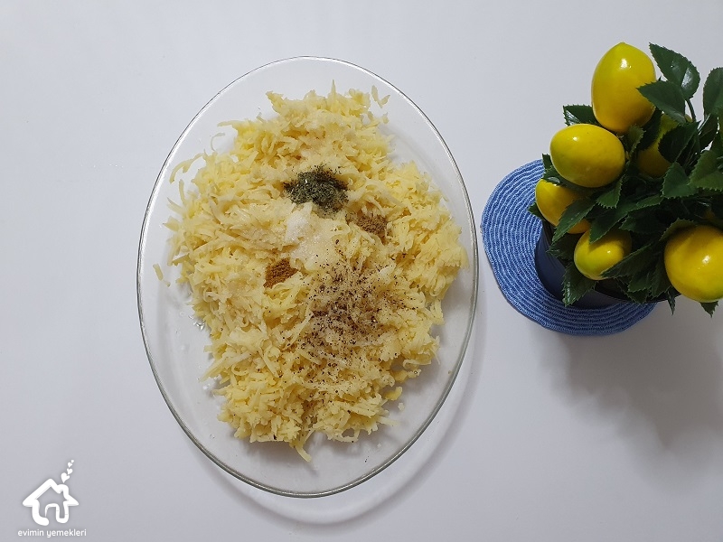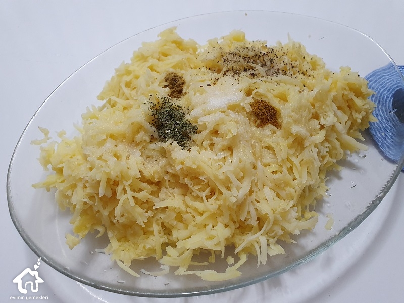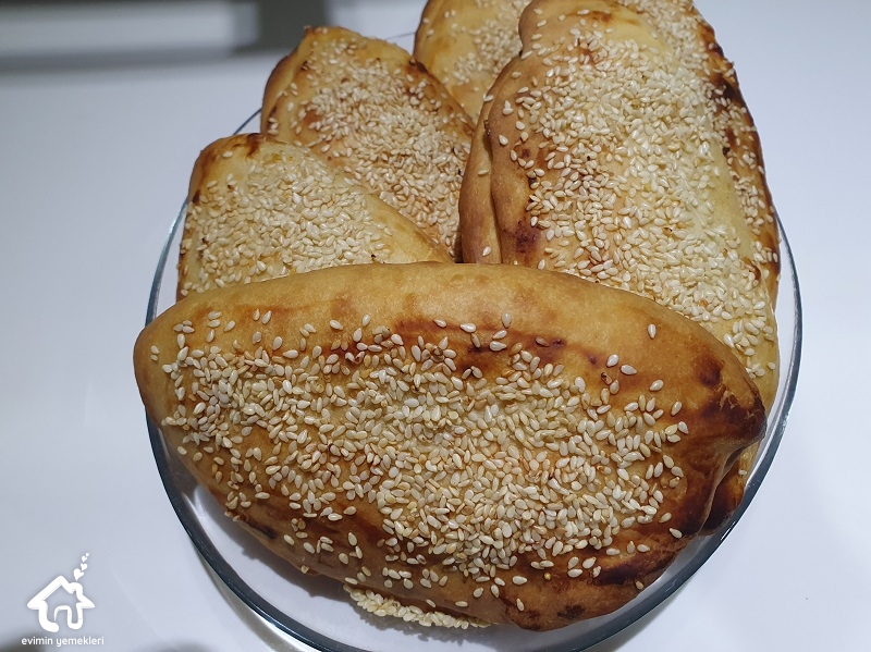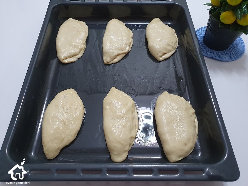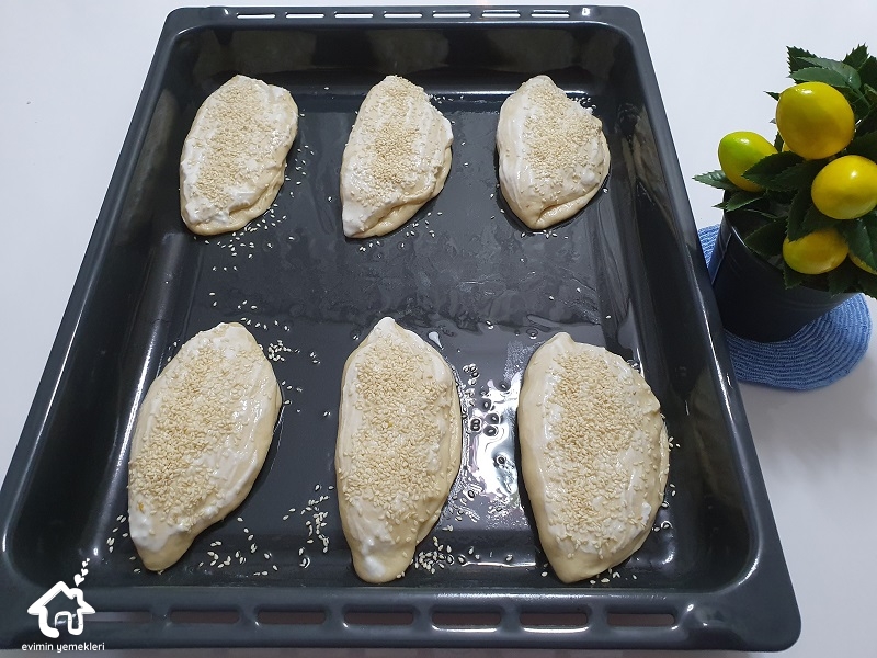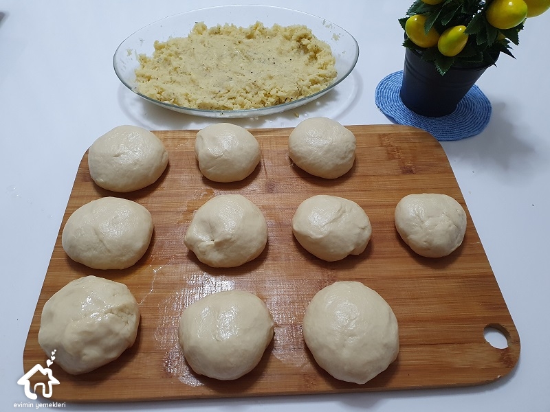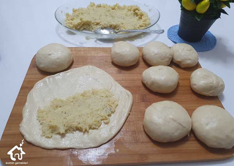 Hamur dinlenirken içi için gerekli olan haşlanmış patatesi rendeleyip içine biraz sıvı yağ, tuz, karabiber ve kimyonu ilave edip elimizle güzelce karıştıralım. Dinlenip kabaran hamurumuzu 15 eşit parçaya bölüp yuvarlayalım. Yuvarladığımız hamurları hafifçe elimizle bastırıp açalım. Çay tabağı gibi açtığımız hamurun yarısına patatesli iç harcından koyup diğer yarısını üzerine kapatalım. Tüm hamuru bu şekilde iç harcıyla doldurup tepsiye dizelim. Tepsideki poğaçaların üzerine bir kaşık yoğurdu fırça ile sürelim. Daha sonra üzerine susam serpip önceden ısıtılmış 200 derecedeki fırında altı üstü kızarana kadar pişirelim.
